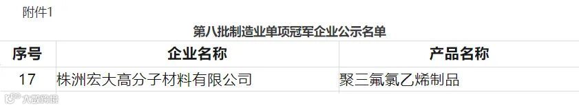 为贯彻落实《关于加快培育发展制造业优质企业的指导意见》(工信部联政法〔2021〕70号),根据《工业和信息化部办公厅关于开展2023年制造业单项冠军企业遴选认定和复核评价工作的通知》(工信厅政法函〔2023〕263号),工业和信息化部将我省第八批制造业单项冠军企业名单予以公示:株洲宏大高分子材料有限公司荣获国家制造业单项冠军企业!