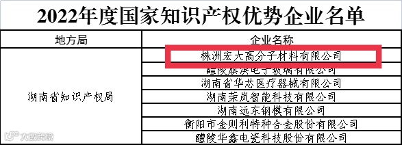 近日国家知识产权局运用促进司对2022年度国家知识产权优势企业和示范企业评定结果进行了公示,株洲宏大高分子材料有限公司获得国家知识产权局的肯定,荣获2022年度国家知识产权优势企业。