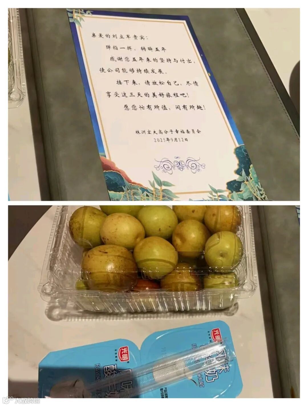 入住酒店,大家就收到了来自宏大高分子幸福委员会的暖心祝福、美味水果和酸奶,大家感受到满满的温暖和惊喜,在这青山绿水间有家人的陪伴,有一起奋斗的伙伴,更有公司的贴心安排~