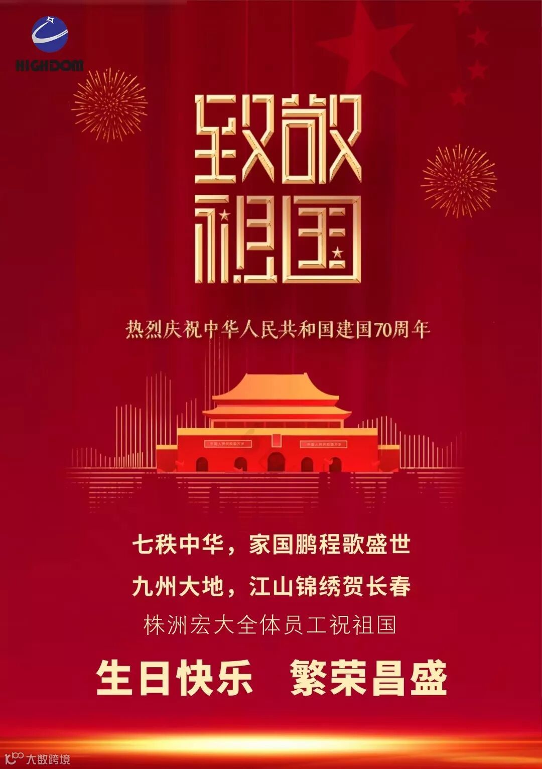 金秋十月,红旗飘扬,举国同庆。我们满怀喜悦,迎来了中华人民共和国成立70周年。在这个喜庆日子里,株洲宏大高分子材料有限公司衷心祝愿我们伟大的祖国欣欣向荣、繁荣昌盛!祝大家国庆快乐、身体健康、家庭幸福!