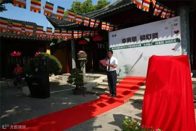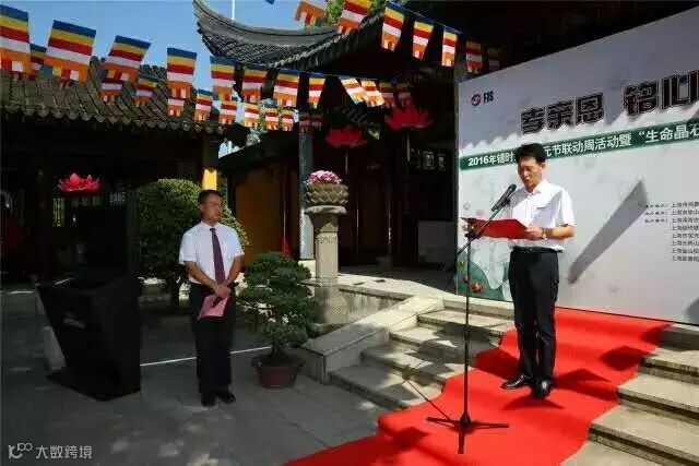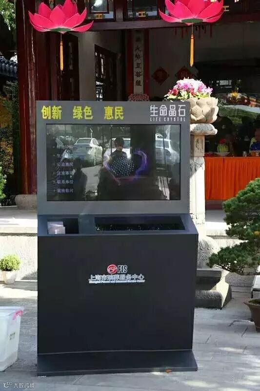 时间刚到八点,归园阁已经迎来了各方来宾。今天的归园阁装扮一新:中心位置巨大的活动主题背景格外醒目,左右对称的石头莲花柱上安插着鲜艳的花朵,两旁屋檐下吊挂着好多的荷花灯,呼应着中元节放河灯的民间习俗。活动现场摆放的“生命晶石宣传机”吸引着众人的眼球,这款宣传机由中心特别制作,并配备了触摸显示大屏幕。里面有“生命晶石”的宣传视频、制作工艺等信息,满足了现代人接收咨询的方式。还有宣传单页,注明了办理“生命晶石”的方式方法。
