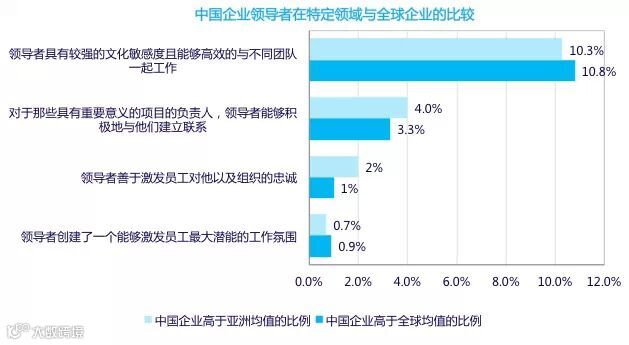 【2】中国企业领导者在特定领域较全球其他国家存在较大优势:他们更善于跨文化合作;更乐于帮助员工实现个人目标;在为下属创建更好的个人和组织忠诚度方面更突出;以及更善于创造激励员工的企业文化。