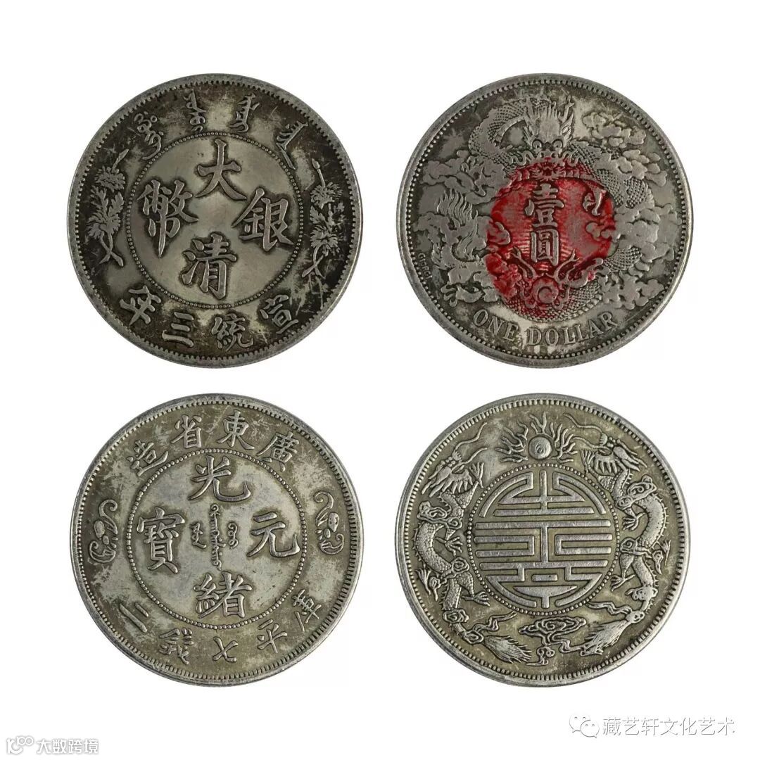此组钱币分别为宣统三年大清银币壹圆,广东省造光绪元宝库平七钱二。大清银币钱币正面珠圈内刻汉字“大清银币”四字,珠圈外上端为满文,下缘为汉字“宣统三年”字样,字体工整,笔画铿锵有力。左右两旁分列长枝菊花纹饰。钱币背面中间为刻有汉字“壹圆”,下缘为英文“壹圆”,神龙沿边缘自左向右腾云而起,环绕一周,龙头置上,两根卷须横伸,龙鳞有序,颗粒可见,龙眼凸起,炯炯有神,鼻梁俏上,威武霸气,彰显皇家威严。