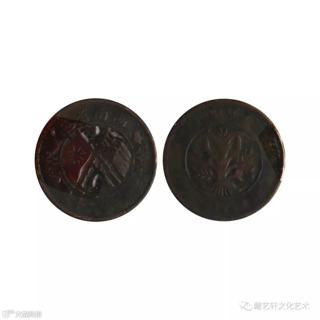 双旗币:此枚双旗币为湖南省造双旗币当制钱二十文,钱币正面中央图案为“十九星铁血旗”和“五色国旗”交叉而立、旗后有缨带,双旗寓意全国一统与民族大团结;圈外上部书湖南省造纪地;左右饰以团菊花纹;下方则镌“當制錢二十文”标明币值。钱币背面正中图案则为稻穗组成嘉禾纹,寓意丰民足岁。该湖南省造双旗币品相良好,制作精致,藏品包浆自然,色泽自然,给人一种凝重的历史沧桑感。