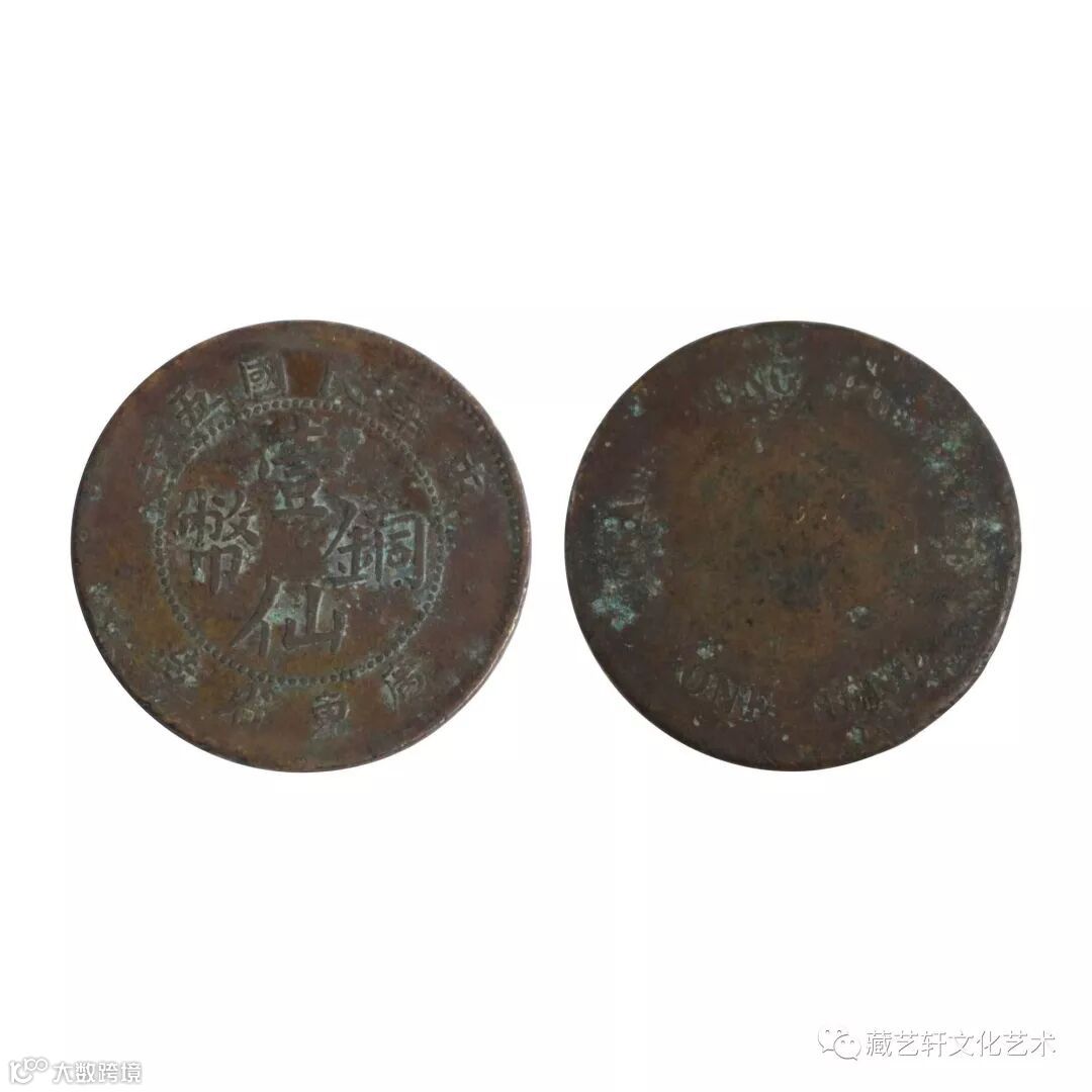 此件藏品为中华民国五年广东省造壹仙铜币,钱币正面珠圈内为壹仙铜币四个大字,珠圈外部上缘书“中华民国五年”纪年;珠圈外部下缘书“廣東省造”标明铸地,书写清晰,镌刻精细。钱币背面的绿锈以及流通时的磨损见证了其历史年代的沉积,不难看出它明显的历史过渡性特征,该铜币虽然历经沧桑,但纹路依然隐约可见,有着难以言表的收藏投资价值。