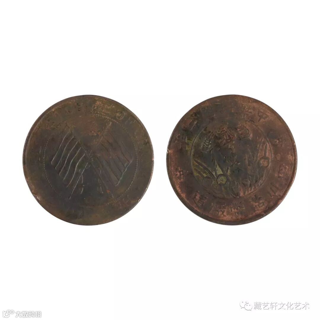 民国成立后,铜元仍继续大量流通使用。1914年,铜元正式改称“铜币”,民国发行的铜币与清最大的区别是龙纹被换成了由稻穗组成的嘉禾纹。各省铸造的铜元大多为两面叉的国旗图案。