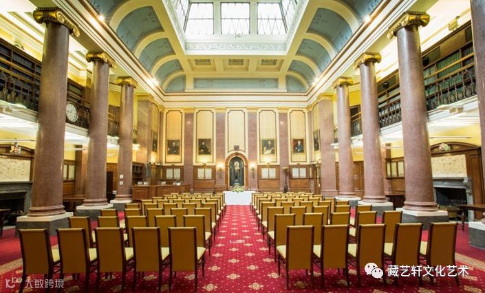 建筑内优雅壁炉楣雕刻出自于英国雕塑家吉尔伯特贝叶斯(Gilbert Bayes),并以Bayes名字为这个房间命名。英国最著名的百货公司之一,位于牛津街上的Selfridges正门上方的时间女王钟也是出自Bayes之手。房间两侧是高耸的大理石柱,楼顶的天窗设计让整个房间有着充沛的自然光线,拱形的天花板搭配着房间的丰富色彩加上墙上的木制的镀金镶边的挂画令房间相得益彰。二层的书架上整整齐齐排满了皮质包装的书本更令房间添加了一层历史气息。
