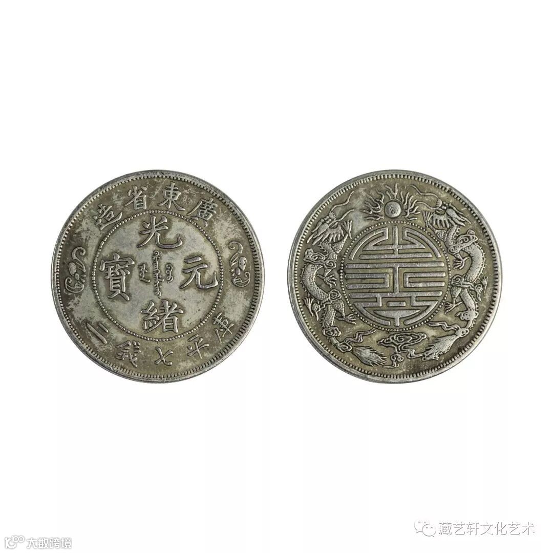 光绪元宝,钱币正面珠圈外的上端镌刻 “广东省造”四字,下端镌刻“库平七钱二”五字,左右两侧各铸有一蝙蝠图案。珠圈内铸有满、汉文“光绪元宝”四字。银币背面珠圈外面铸有双龙戏珠图案,珠圈里面铸有一圆形“寿”字。“寿”字寓意为纪念慈禧太后六十寿辰而铸造。