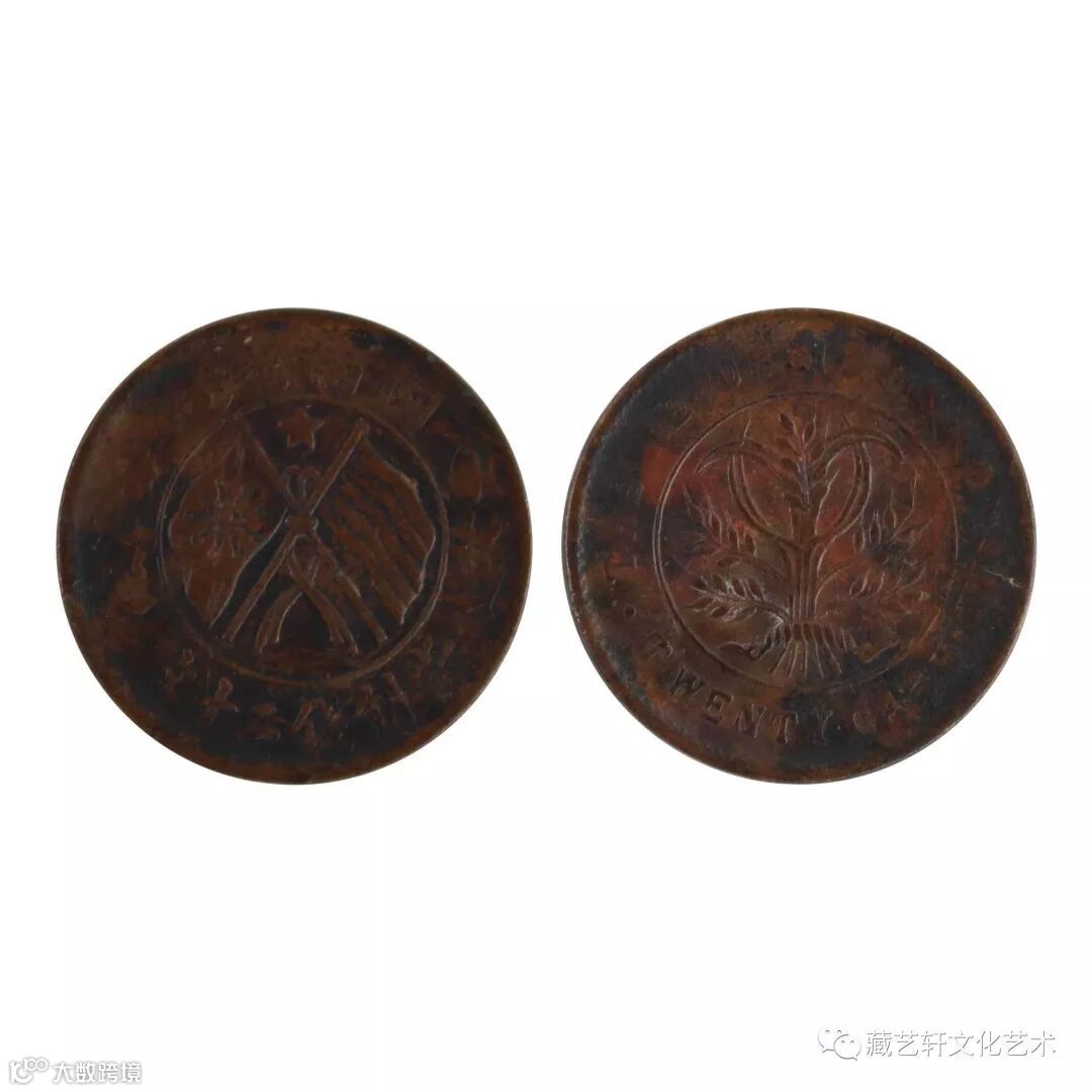 此枚铜币正面面图案中央为两面交叉的国旗,上方为“湖南省造”四字,下面为记值:当制钱二十文;藏品正背面中心图案为稻穗组成的嘉禾纹及英文,此币包浆自然,字口纹路深邃,钱币经过悠久的历史下依然保存完好,经平台老师鉴赏为真品无疑,极具收藏价值和投资价值。有喜欢的买家可联系本平台。