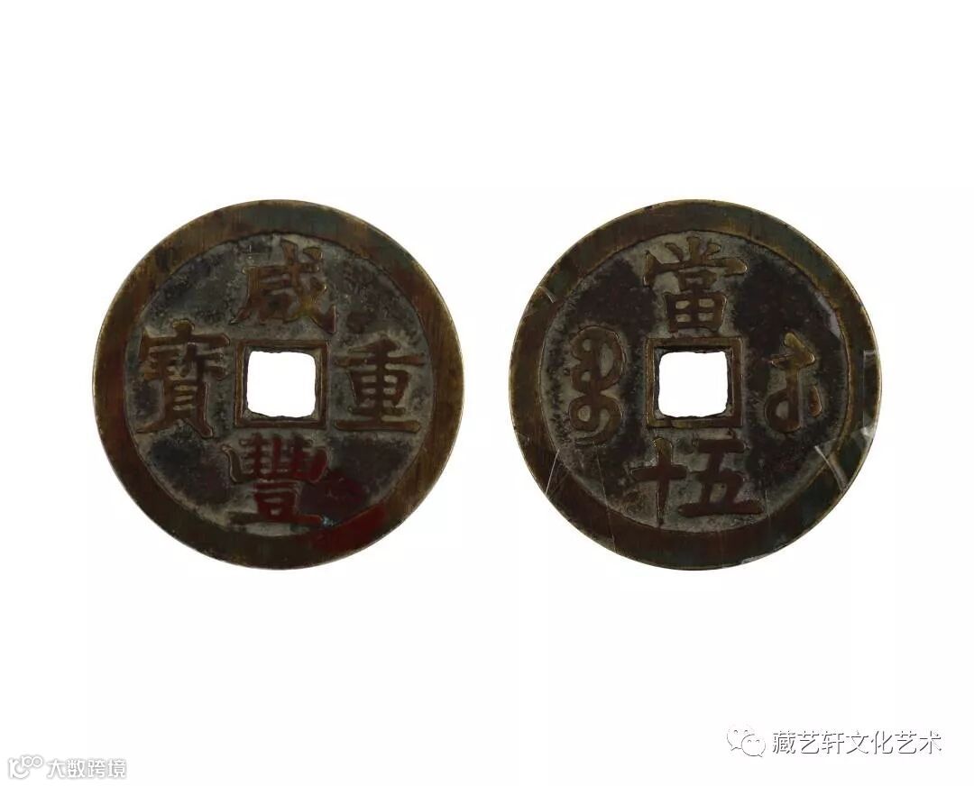 此组咸丰重宝,前者为“当五十”,后者为“当十”。藏品正面皆镌有“咸丰重宝”四字,背面上下两端镌有面值“当五十”,“当十”。左右分别镌有满文“宝”,“武”。咸丰重宝是一种铜钱,此组铜钱币十分精美,字迹清晰深俊,铜材优良,呈浅红黄色,钱文精美,没一丝一毫拖泥带水,比同版流通的钱稍大些、厚重些。由于铸造时间早,流通区域广,所以也是自古以来古藏爱好者最关心并致力于收藏和欣赏的计值钱币。在两枚咸丰重宝之中,又当推举咸丰重宝当十钱币为最。铸期最长、数量最大、版式最多、流通最广。此组藏品具有极高收藏价值,许多收藏家对它爱不释手,争相起价。
