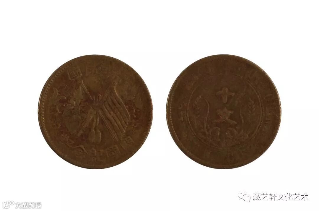 双旗币为中华民国开国纪念币十文,正面是双旗图案,旁边装饰兰花图样,钱币上下以篆书雕刻“中华民国开国纪念币”字样。反面饰有嘉禾纹与“十文”字样。该钱币纹样精美,包浆自然,表面虽有轻微磨损,但不影响其整体美感,反而多了一分历史沧桑感。
