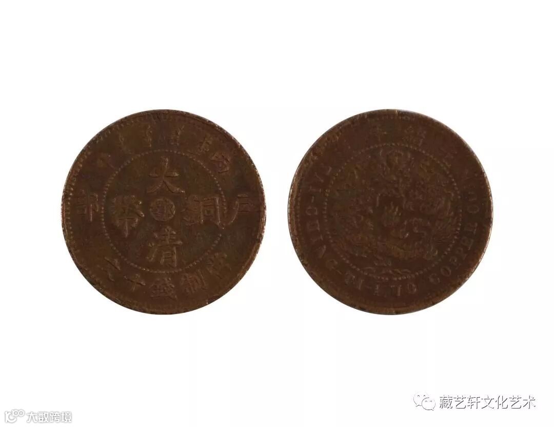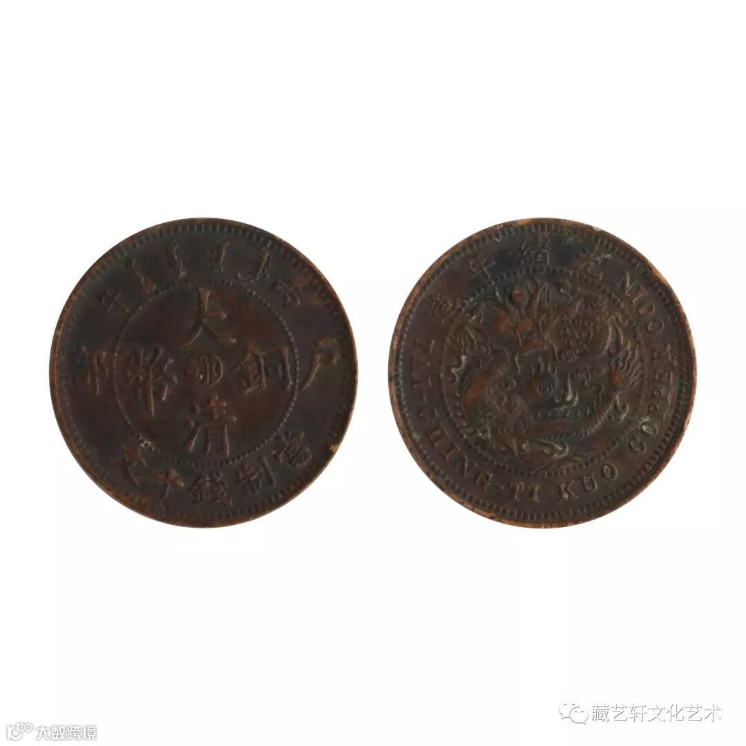 此大清铜币,学名清代机制铜圆,钱币正面中央有“大清铜币”四个汉字,内嵌“鄂”代表地名,上端是满文“大清铜币”字样,两侧为“丙午”年。边缘中间分别“户部”二汉字,下端为“当制钱十文”。钱背中央为蟠龙,上端是“光绪年造”,下端英文“Tai-Ching Ti-Kuo Copper Coin”字样(大清帝国铜币)。
