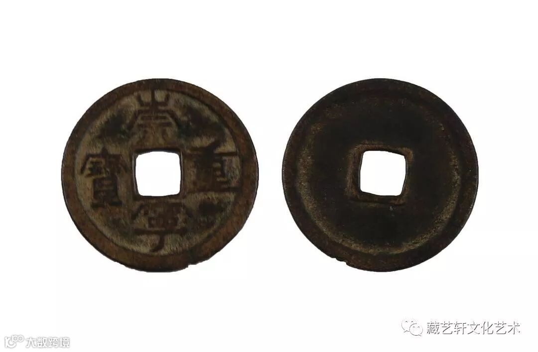 崇宁通宝正面书“崇宁通宝”四字旋读,钱体厚重,锈色古旧,开门的老生坑。此品钱文四字饱满,寄廓接缘。“宝、宁”二字冠点长且向左倾;长点“崇”;斜丁“宁”;高走“通”等。书法超妙绝伦,具有极高的文物收藏价值、历史文化价值以及艺术品鉴价值。