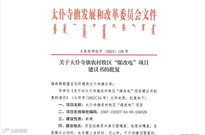 大仆寺旗农村牧区“煤改电”项目建议书的批复