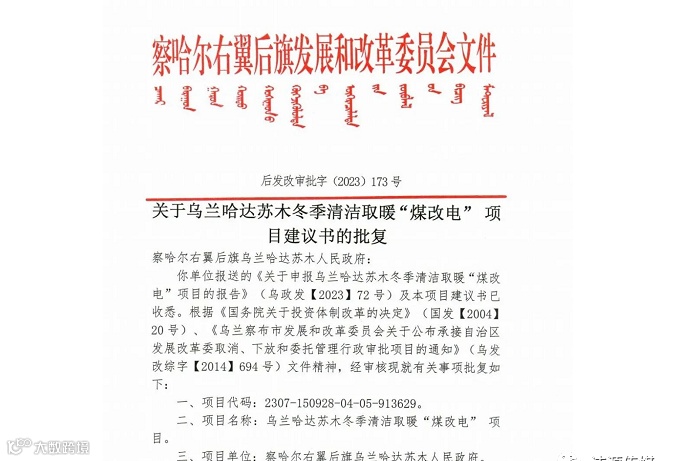 乌兰哈达苏木冬季清洁取暖“煤改电”项目建议书的批复