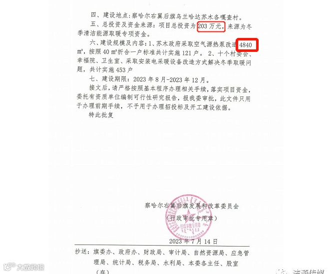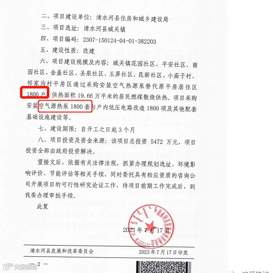 近日,内蒙古发布《关于清水河县发展和改革委员会关于2023清水河县燃煤散烧综合整治工程项目建议书的批复》、《关于乌兰哈达苏木冬季清洁取暖“煤改电” 项目建议书的批复》、《关于太仆寺旗农村牧区“煤改电”项目建议书的批复》,总金额6794.54万元、2488户,清洁取暖设备采购安装空气源热泵等。