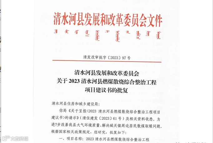 清水河县发展和改革委员会关于2023 清水河县燃煤散烧综合整治工程项目建议书的批复