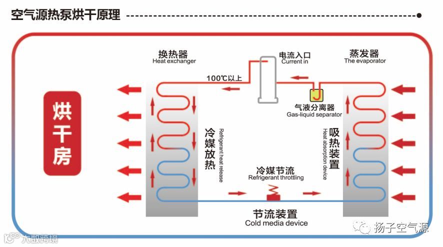 空气源热泵烘干机是一种新式的烘干设备。热泵吸收干制器废气中的低温热能,将热能温度提升后,在用来加热进入干制器的干制介质,并一起将干制器废气中的水分降温凝结为液态水排出。