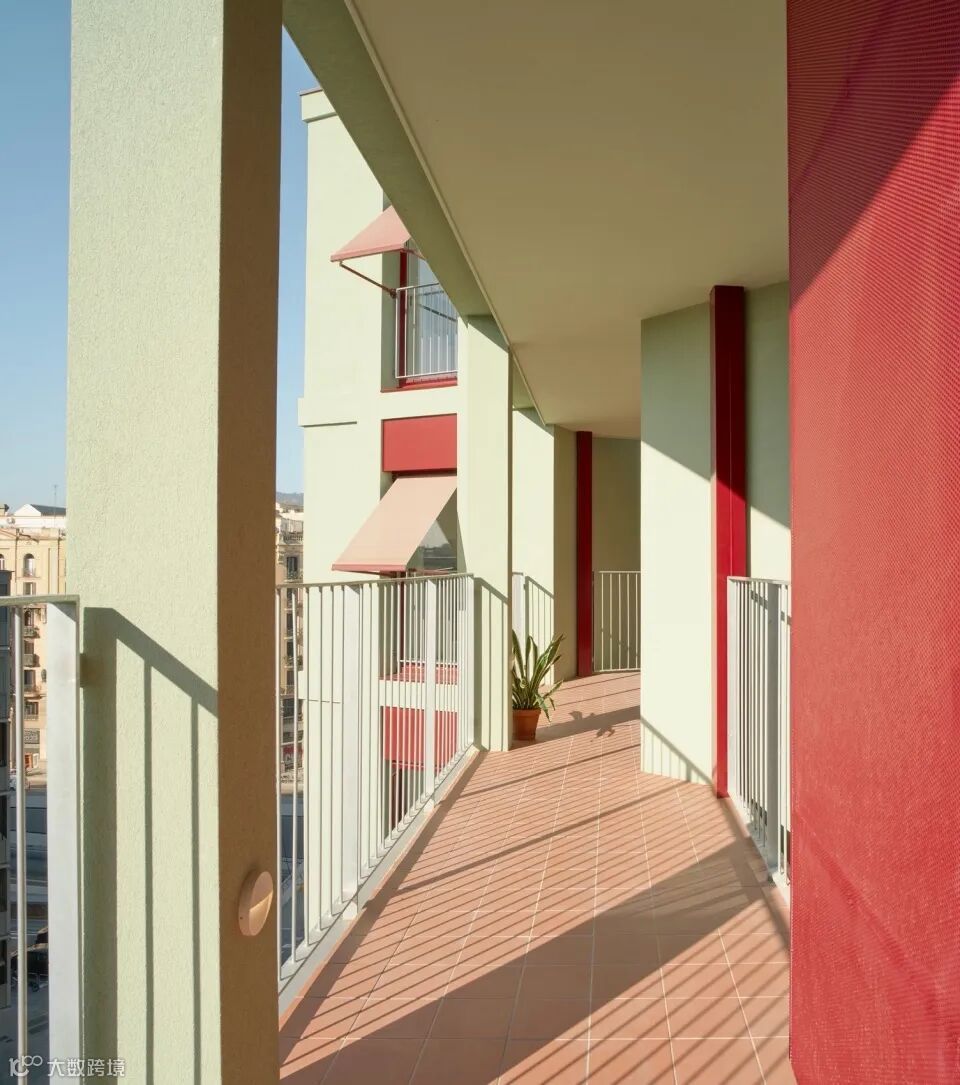 项目设计了一个创新的出入口系统,完美地连接了公共和私密领域,培养了社区感同时保留了家庭的亲密性。从街道进入,居民进入一个宽敞的绿色庭院——这是一个气候庇护所,邻里在这里共享休闲和照顾。这种社区感通过面向南方的宽阔走道进一步增强,走道将住宅与一个共享的屋顶连接起来,成为一个绿色的绿洲,有助于对抗过度的城市热量。作为集体阳台,这些走道不仅作为共享空间,也通过内立面的退让保护了隐私。走道在住宅入口处扩展,突出厨房和家庭生活的中心作用,加强了家务任务的可见性。