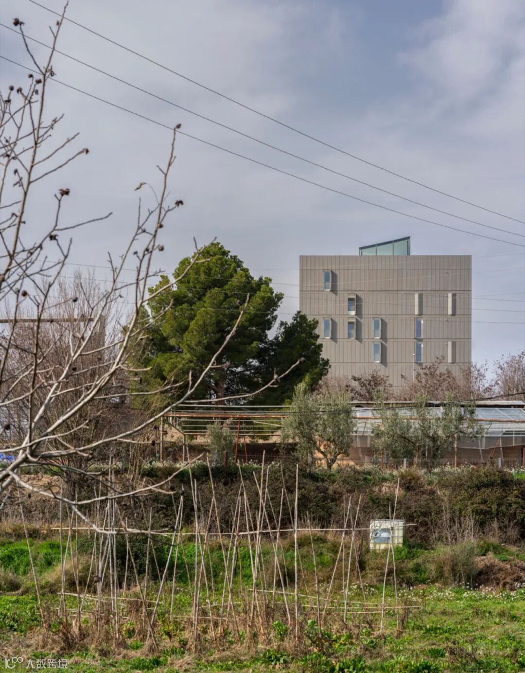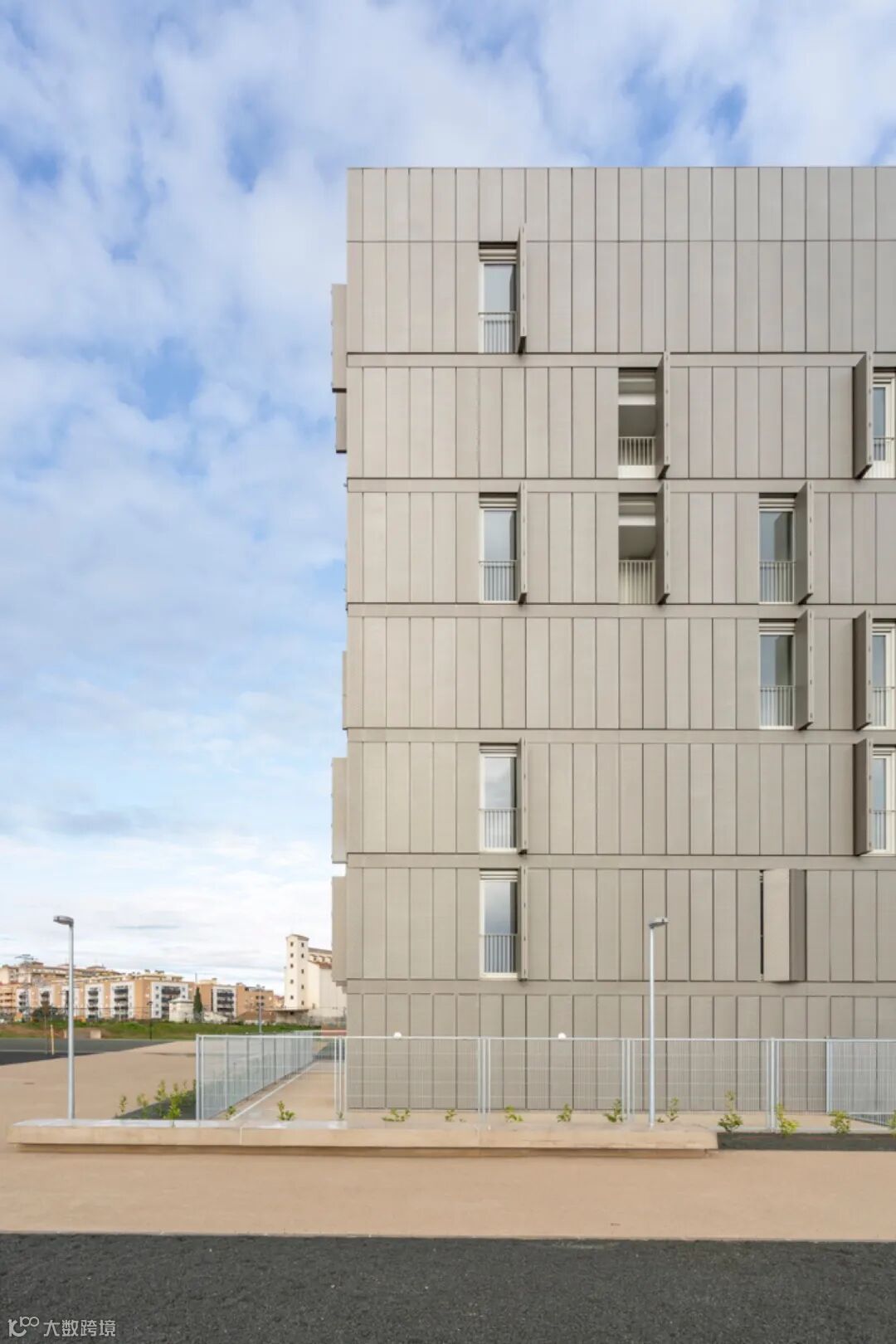 项目选址位于城市肌理的边缘,与河岸的农业景观相对,这一地理位置暗示了其与地平线之间强烈的关系。这种“边界性”赋予建筑“瞭望塔”般的姿态,它以一种坚定的体量回应环境,同时试图将周边的色调与光影倒影纳入立面之中,如同镶嵌在河岸地带的锚点。