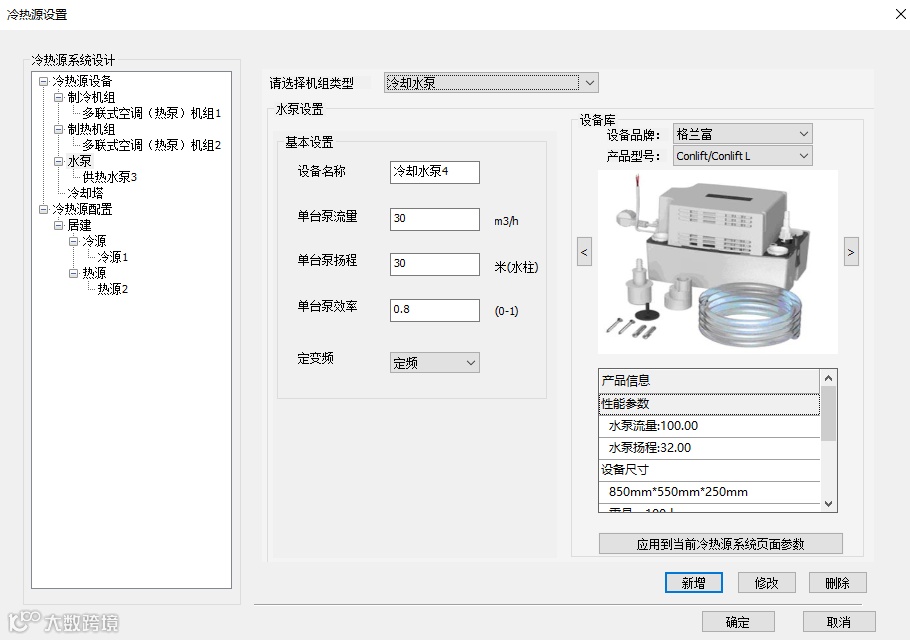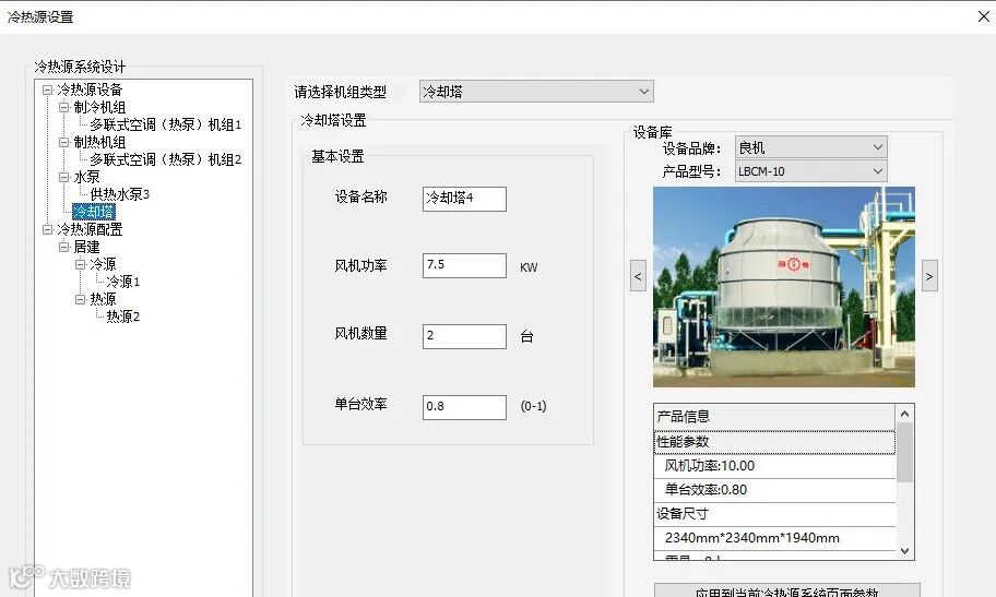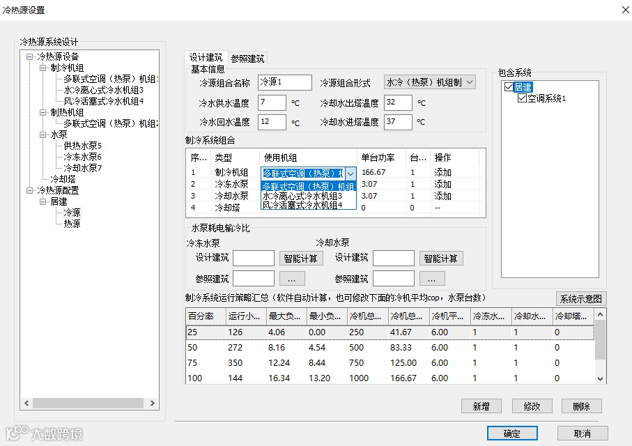 冷热源配置需完成冷源、热源、冷热合一系统的设备组合设置,以水冷(热泵)机组系统为例,包含水冷离心式冷水机组、冷冻水泵、冷却泵、冷却塔等设备,热源参数逻辑与冷源一致。