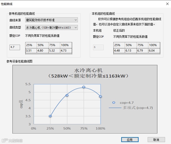 · 默认模式:参照《建筑能效标识技术标准》水冷机组性能曲线,选择对应曲线类型后,结合输入的额定 COP,自动计算不同负荷率下修正后的性能系数。