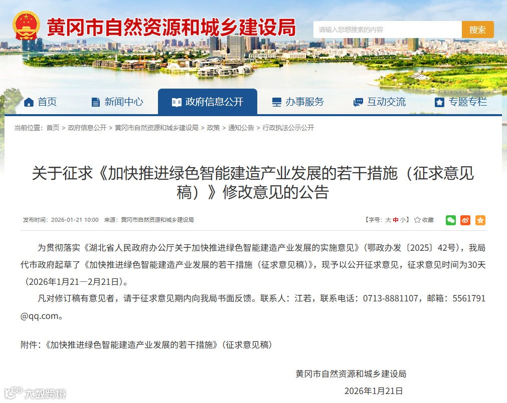 为贯彻落实《湖北省人民政府办公厅关于加快推进绿色智能建造产业发展的实施意见》(鄂政办发〔2025〕42号),黄冈市自然资源和城乡建设局代市政府起草了《加快推进绿色智能建造产业发展的若干措施(征求意见稿)》。