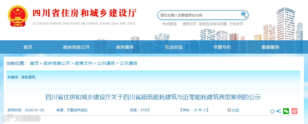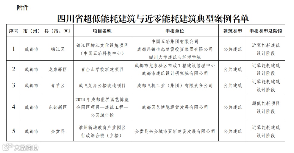 根据《四川省住房和城乡建设厅关于征集超低能耗建筑与近零能耗建筑典型案例的通知》(川建勘设科函〔2025〕573号)有关要求,经项目单位申报、市(州)住房城乡建设局初审推荐及专家评审,现将评审通过的锦江区柳江文化设施项目(中国五冶科技中心)等5个典型案例项目予以公示(详见附件),公示期为2026年1月26日至2026年2月4日。