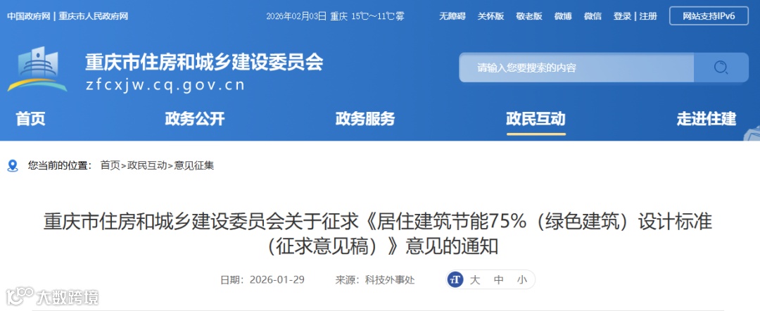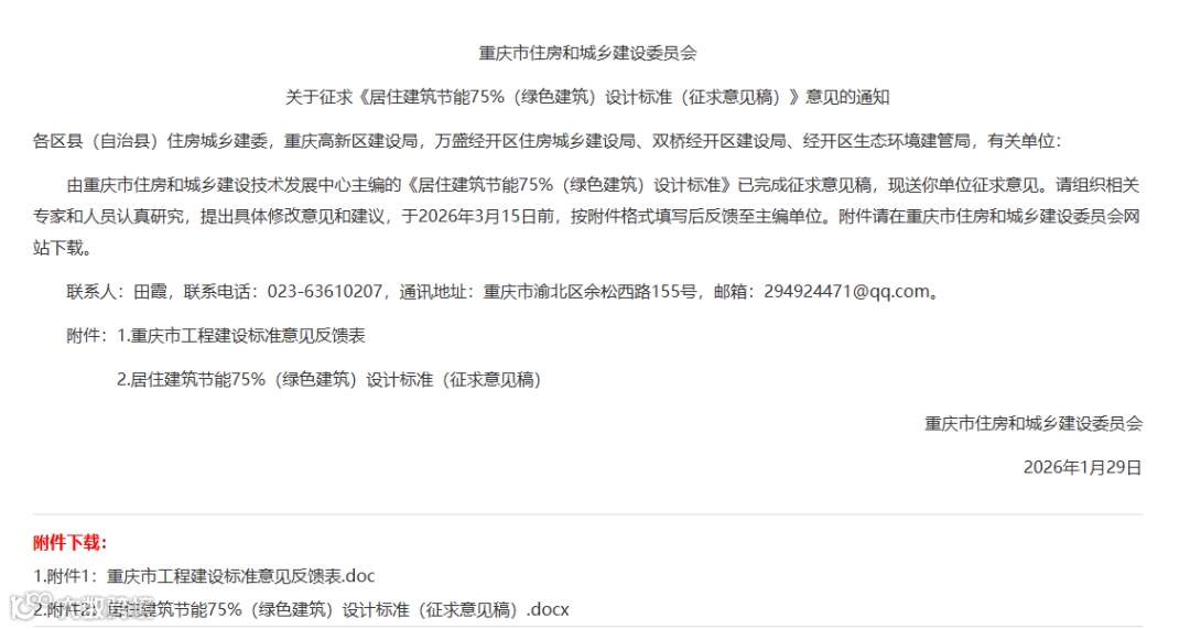 由重庆市住房和城乡建设技术发展中心主编的《居住建筑节能75%(绿色建筑)设计标准》已完成征求意见稿,现送你单位征求意见。请组织相关专家和人员认真研究,提出具体修改意见和建议,于2026年3月15日前,按附件格式填写后反馈至主编单位。附件请在重庆市住房和城乡建设委员会网站下载。