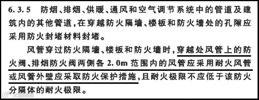 目前,对于防排烟风管防火包裹,行业认可度比较高的看法是,仅按照GB50016-2014(2018年版)《建筑设计防火规范》第6.3.5条文即可,仅在防火阀两侧各2m范围内设置防火包裹。