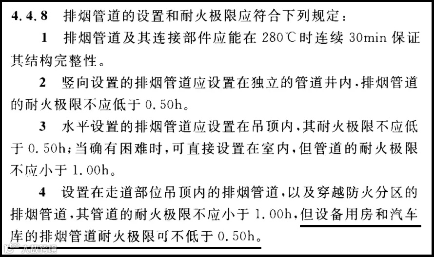 GB51251-2017《建筑防烟排烟系统技术标准》第4.4.8条文:设备用房和汽车库的排烟管道耐火极限可不低于0.5h。