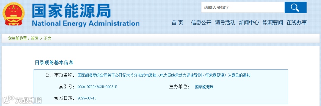 为贯彻落实党的二十届三中全会关于完善新能源消纳和调控政策措施的要求,进一步释放提升配电网对分布式新能源的接纳、配置和调控能力,按照国家能源局能源领域行业标准制修订计划,我局组织有关单位对《分布式电源接入电网承载力评估导则》(DL/T 2041-2019)进行了修订,形成《分布式电源接入电力系统承载力评估导则(征求意见稿)》,现向社会公开征求意见。