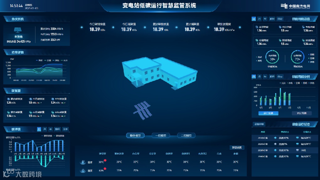 研究内容:通过综合构建变电站碳排放与能耗精准计算体系、规划高效光伏智能系统建设方案、开发变电站的绿色低碳智慧监管系统,以及制定全面的碳排放管理体系,旨在深度挖掘电力行业节能减排潜力,优化资源配置,加速绿色转型进程,打造“可实现、可复制、可推广”的变电站低碳建设与运行方案,为电力行业实现可持续发展目标提供重要支撑和示范样本,共建实现零碳变电站。