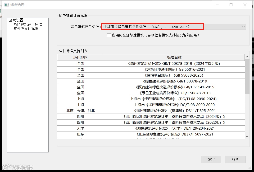 软件支持《绿色建筑评价标准》(DG/TJ08-2090-2024)、《绿色建筑评价标准》GB/T 50378、《建筑环境通用规范》GB 55016-2021等标准设计和审查要求。