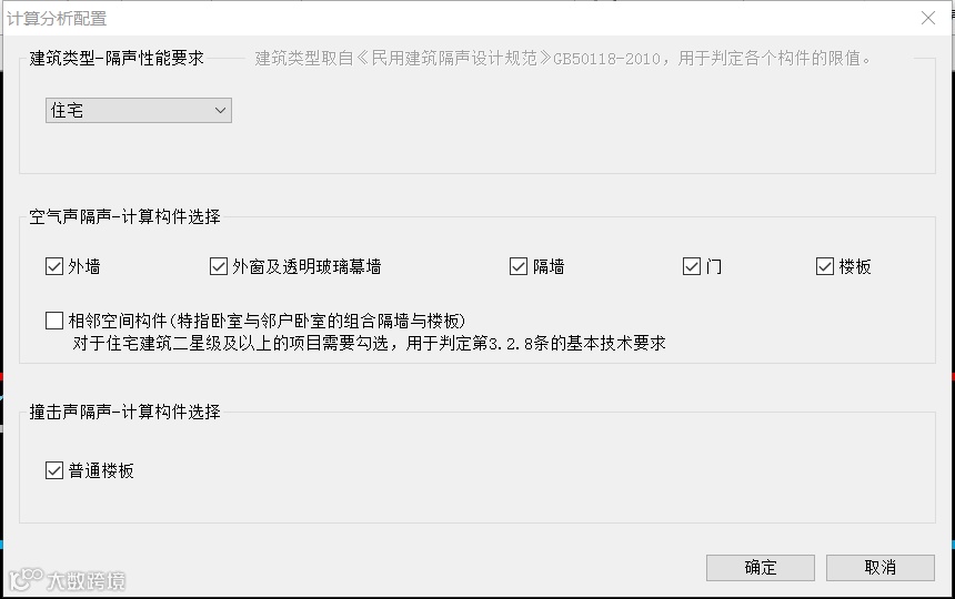 软件支持室外声+构件隔声+背景噪声分析,将室外计算和室内计算相结合,只需一款满足建筑室内外声环境设计仿真需求。支持3.2.8条星级住宅隔声要求判定选择,支持5.2.6条建筑结构声源的设置。