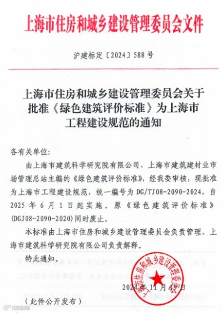 为更好地衔接《上海市绿色建筑条例》,支撑上海市绿色建筑项目评价工作,上海市住房和城乡建设管理委员会批准发布《绿色建筑评价标准》(DG/TJ08-2090-2024),将于2025年6月1日起正式实施。根据《上海市绿色建筑条例》,2025年1月1日起签订土地出让合同或取得建设项目规划土地意见书(划拨土地取得立项批复)的项目应按照《条例》第十三条落实绿色建筑星级要求;6月1日以后送施工图审查的建设工程项目,施工图审查机构应严格依据《条例》第十三条中绿色建筑星级以及现行绿色建筑设计标准和评价标准的要求,对项目施工图设计文件中的绿色建筑专篇内容进行审查。