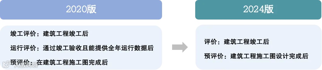 将原“预评价、竣工评价、运行后评价”三阶段调整为 “预评价”和“建筑工程竣工后评价”两个阶段,简化流程并聚焦实施可行性。
