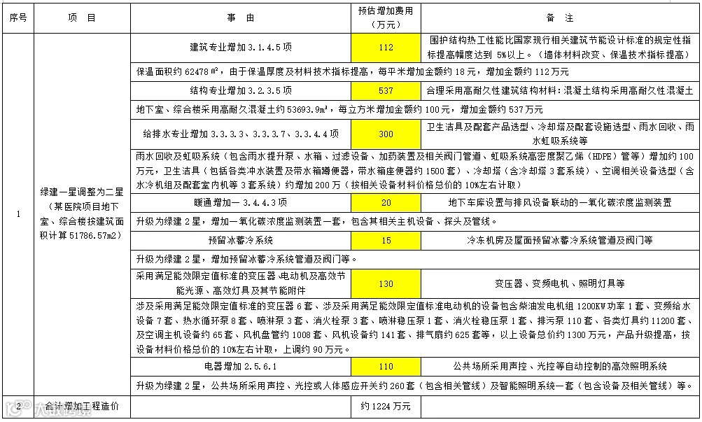 绿色建筑在初始投资阶段通常会涉及一些额外的成本,这些成本主要涵盖了设计、材料和技术的选择,以及认证和监管程序的实施。例如,使用环保材料和能源效率设备通常会比传统材料和设备更昂贵。此外,需要专业的工程师和设计师来规划和执行绿色建筑项目,这也会增加项目的初始成本。然而,这些额外成本可能在建筑的生命周期内得以弥补,因为绿色建筑通常能够降低能源和维护成本。以某医院项目一个单体为例,从绿建一星调整为绿建二星,其建筑装饰及安装工程涉及初始建安成本的如下表: