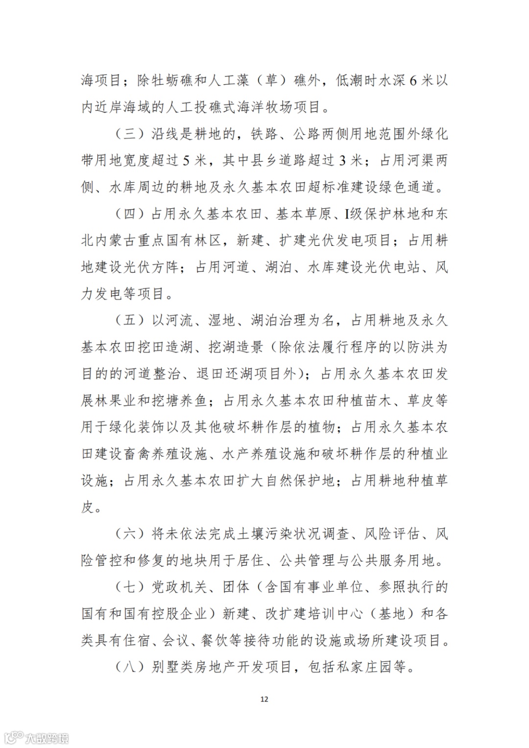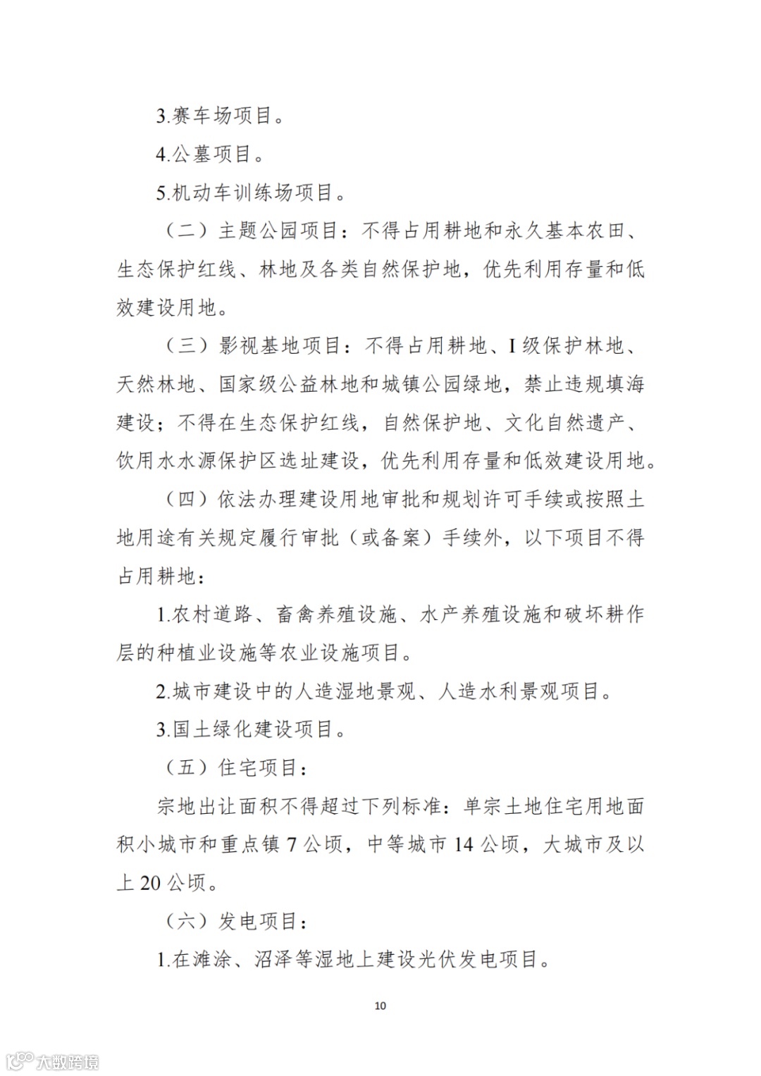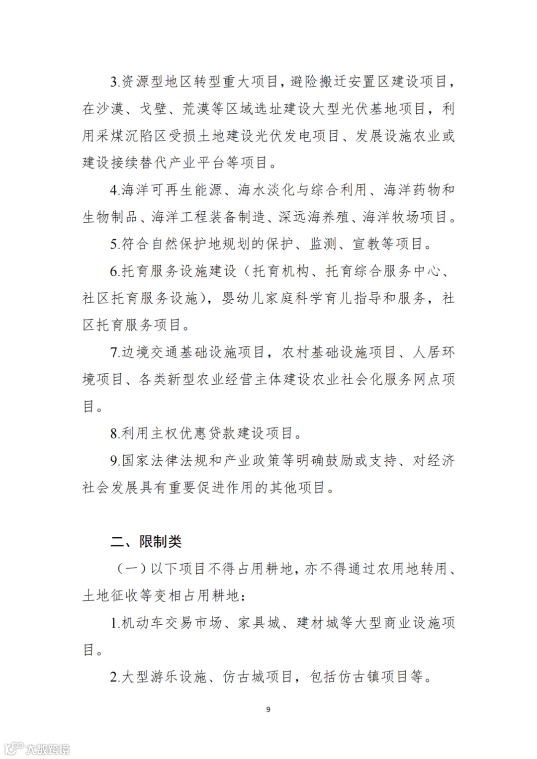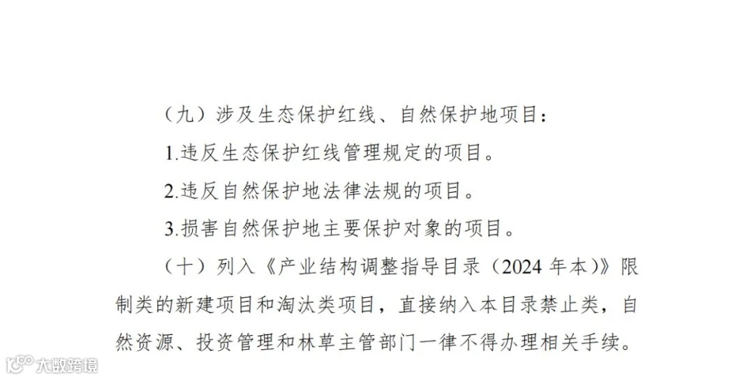 禁止类项目包括:占用永久基本农田、基本草原、Ⅰ级保护林地和东北内蒙古重点国有林区,新建、扩建光伏发电项目;占用耕地建设光伏方阵;占用河道、湖泊、水库建设光伏电站、风力发电等项目。