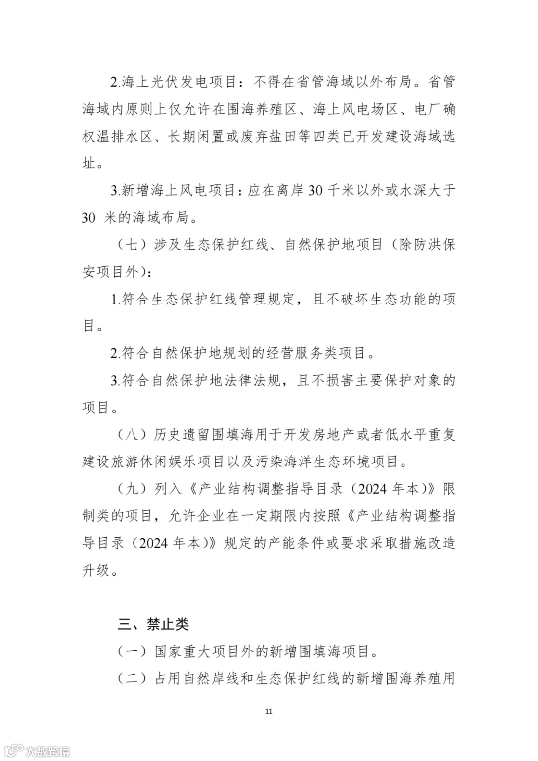 限制类项目包括:在滩涂、沼泽等湿地上建设光伏发电项目;海上光伏发电项目则不得在省管海域以外布局。省管海域内原则上仅允许在围海养殖区、海上风电场区、电厂确权温排水区、长期闲置或废弃盐田等四类已开发建设海域选址。