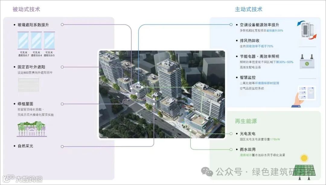 太阳能光伏发电:通过幕墙设置水平外遮阳光伏铝板,屋面铺设176kW容量光伏发电装机,年供应电量可达19万kW·h,满足D6#电力自产自用。