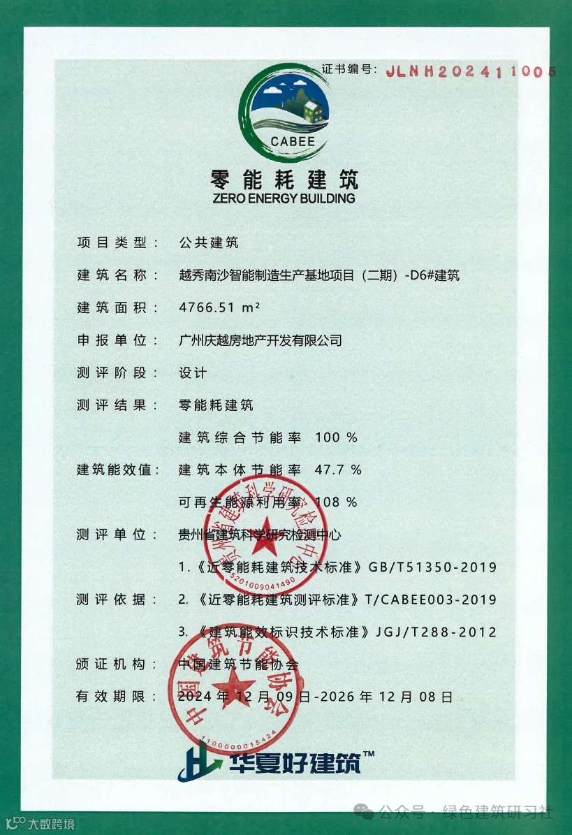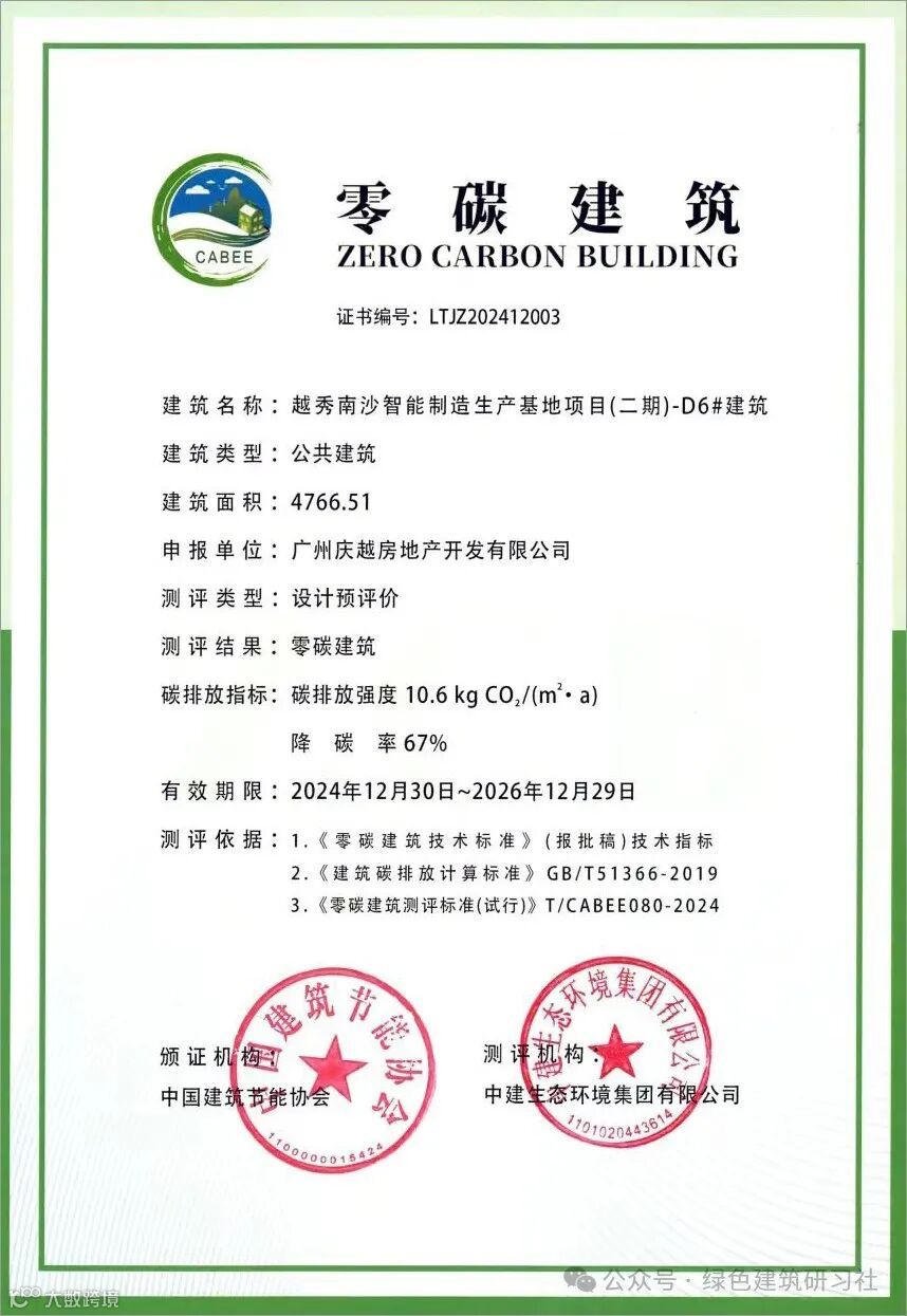 2024年12月9日,越秀iPARK粤港云谷(南沙智能制造生产基地二期)D6#建筑荣获“零能耗建筑设计认证”,12月30日,项目再获“零碳建筑设计认证”。项目是广州市首个零碳产业园建筑,也是华南地区首个获得零碳和零能耗“双零”认证的产业园建筑。