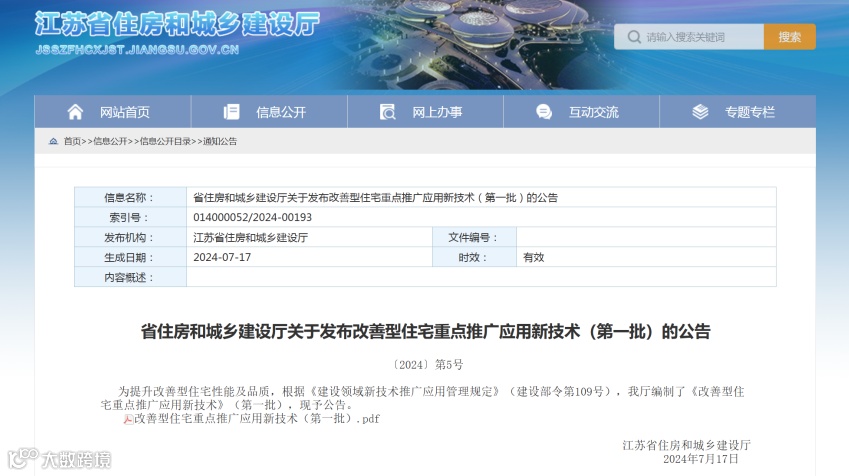 为提升改善型住宅性能及品质,根据《建设领域新技术推广应用管理规定》(建设部令第109号),江苏省住房和城乡建设厅发布《改善型住宅重点推广应用新技术》(第一批)。