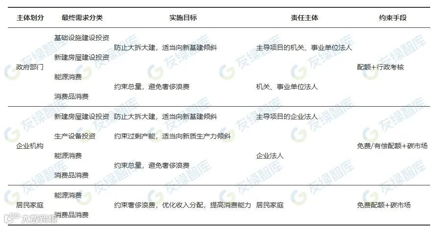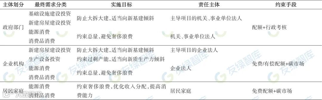 从实施目标来看,基于国家层面的碳总量控制目标,可进一步将总量以碳排放责任配额的形式分解到各消费领域,以实现“抓需求结构升级”。