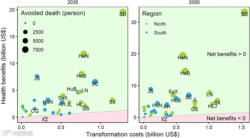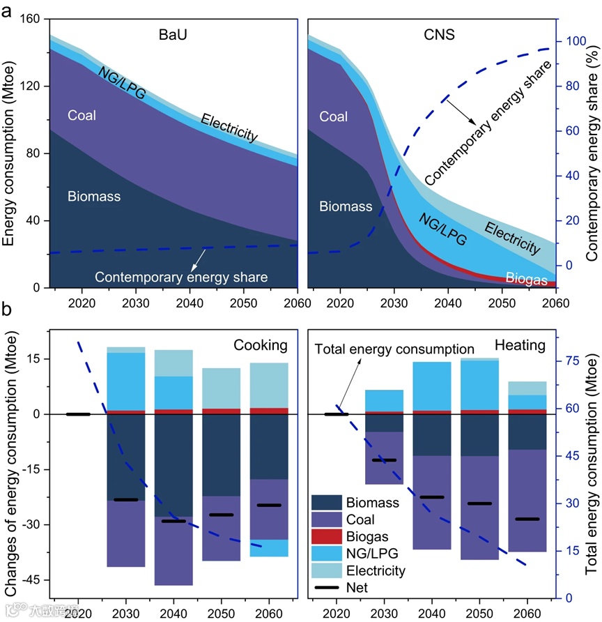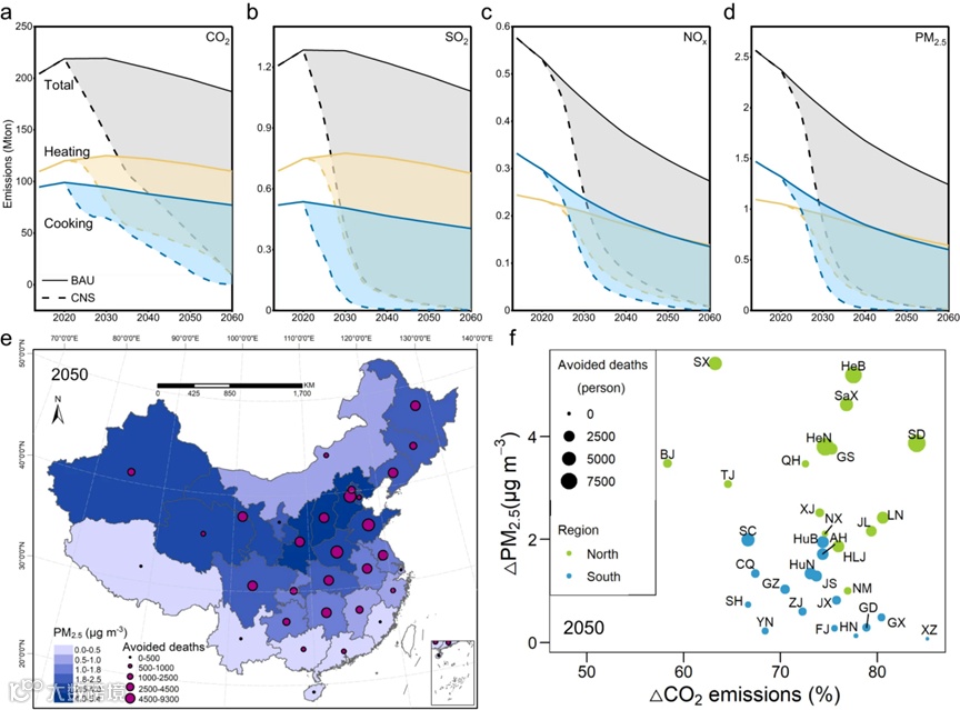 研究表明,中国北方的农村实现碳中和可以带来可观的协同效益。仅住宅部门的脱碳工作就可以减少75500例由PM2.5污染导致的提前死亡,其中69%的减排来自于北方农村的转型,同时,到2060年,由于煤炭仍被大量采用,因此中国北方仍具有极大的转型减排潜力。