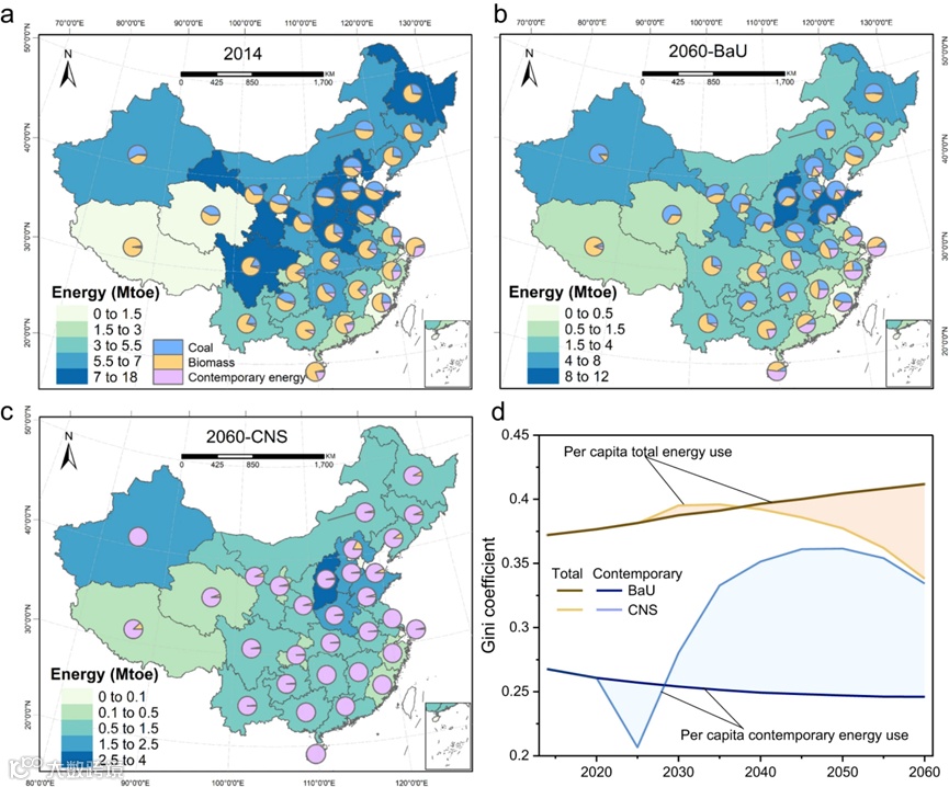 从不同省份来看,总体上各省农村的能源消耗都呈下降趋势。在BaU情境下,各省的生物质燃料会逐步被煤炭和现代能源取代,南方沿海地区现代能源的占比将会有明显的增长,北方地区则会形成以煤炭为主的能源结构。这缓解了农村地区的能源贫困,但也加剧了各省份之间总能源利用的不平等。而在CNS情景下,全国各省都会形成当代能源份额占比82%以上的能源结构。这缓解了各省份之间总能源利用的不平等,但当代能源利用的不平等性在2025 - 2050年间出现了显著的增长,这种波动可能来自于区域差异导致的转型速度与进展差异。