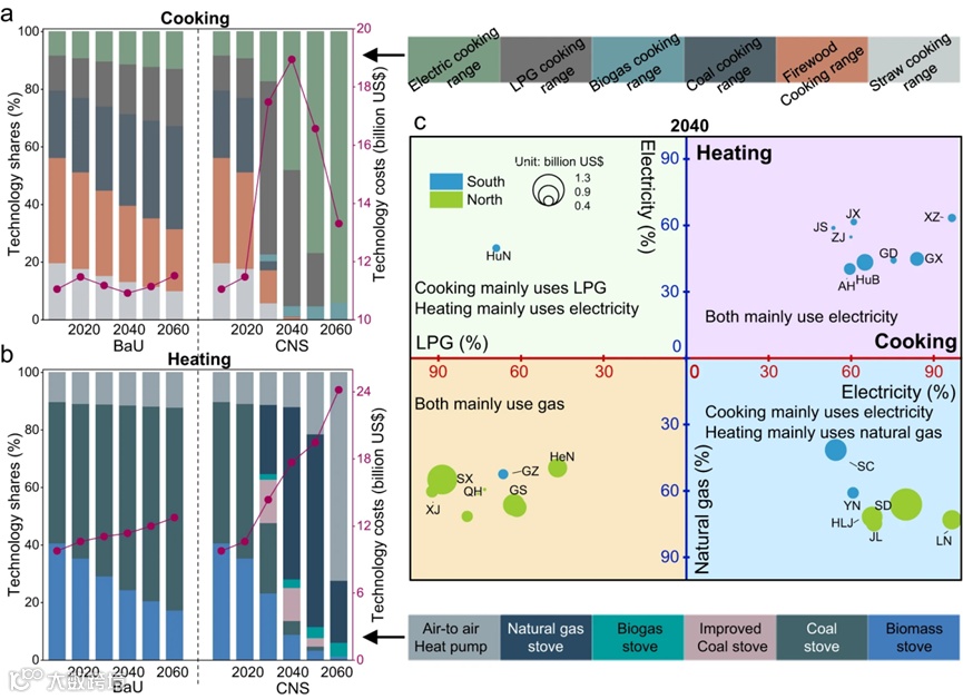 首先,研究基于2014年的数据,计算了当年农村炊事和供暖的总能耗为151Mtoe,总CO2排放量估计为2.04亿公吨(Mton),SO2, NOx和PM2.5的排放量分别为1.21、0.58和2.56 Mton。全国超过80%的炊事和取暖服务需求由主要依赖传统生物质和煤炭的技术满足,包括年化资本成本和能源成本在内炊事和供暖的系统总成本分别为11.1亿和98亿美元。