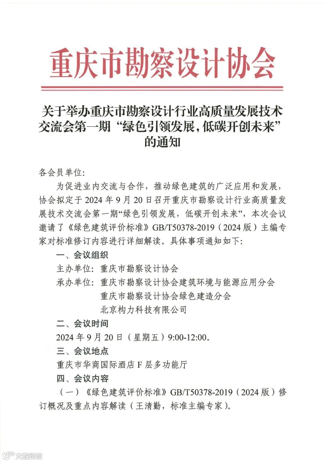 为促进业内交流与合作,推动绿色建筑的广泛应用和发展,拟定于2024年9月20日召开重庆市勘察设计行业高质量发展技术交流会第一期“绿色引领发展,低碳开创未来”,本次会议邀请了《绿色建筑评价标准》GB/T50378-2019(2024版)主编专家对标准修订内容进行详细解读。具体事项通知如下: