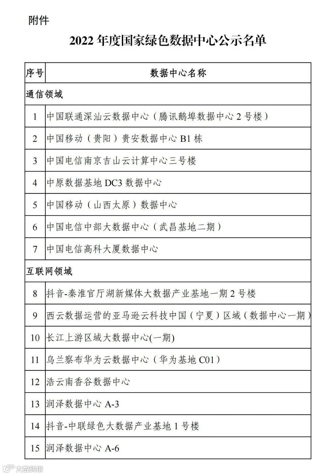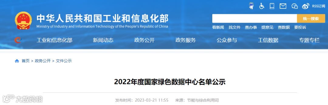 按照《工业和信息化部办公厅 国家发展改革委办公厅 商务部办公厅 国管局办公室 银保监会办公厅 国家能源局综合司关于组织开展2022年度国家绿色数据中心推荐工作的通知》(工信厅联节函〔2022〕299号)要求,经企业申报、省级工业和信息化主管部门会同有关部门推荐、专家评审,现将2022年度国家绿色数据中心名单予以公示,公示时间为2023年3月21日至2023年3月30日(公示期10天)。如有异议,请在公示期内将书面意见反馈至工业和信息化部(节能与综合利用司)。