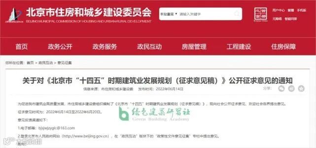 2022年6月14日,北京市住房和城乡建设委员会发布《北京市“十四五”时期建筑业发展规划(征求意见稿)》,向社会公开征求意见,征求意见时间为:2022年6月14日至2022年6月20日。